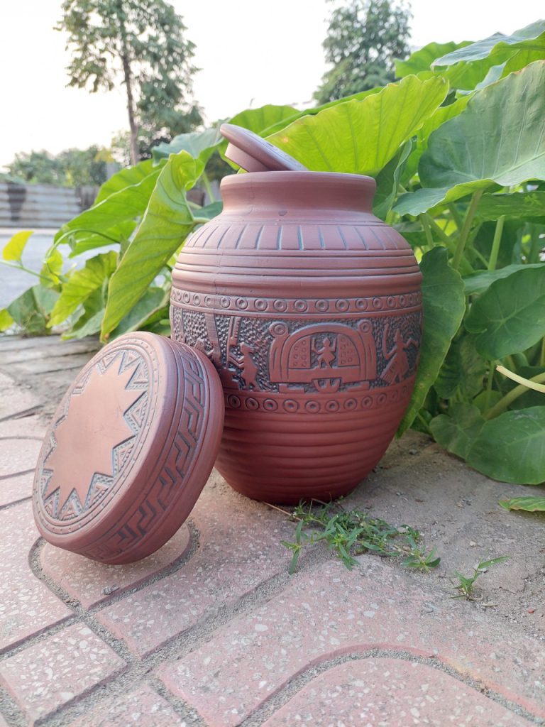 Chum sành ngâm rượu thể tích 5 lít hoa văn Trống Đồng – Hàng kỹ và không tráng men.